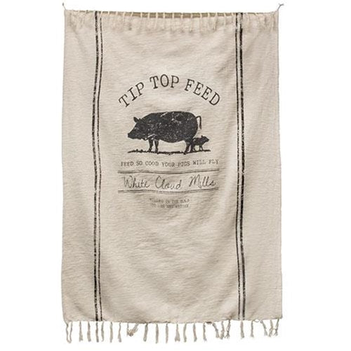 This snuggly neutral throw is country charm in blanket form. With a sweet piglet silhouette and the phrase “Tip Top Feed – So Good Your Pigs Will Fly,” it brings warm humor to your space while keeping things simple and classic. Measures 65” x 50”.